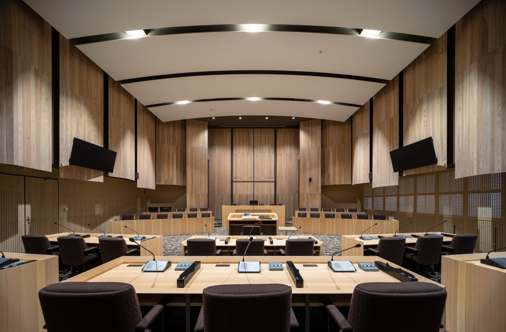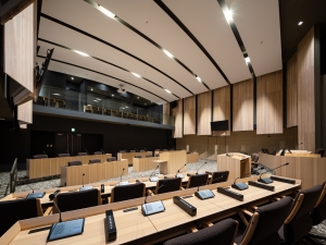 傍聴席においては、安全性と開放感の両立を図り、視界の妨げとならないガラスフェンスを採用しました。椅子や机も視認性や使いやすさを意識して選定し、機能面・意匠面ともに高い品質を追求しています。