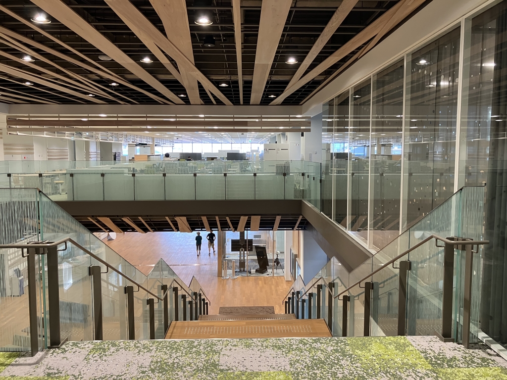 議場とエントランスをつなぐ1階から2階への階段部分に関しては、ガラス素材を用いた間仕切りを施工し、空間全体の統一感と明るさを確保しました。これにより、来庁者が入りやすく、議場の開放感が視覚的にも伝わる設計となっています。ガラスを多用した開放的な空間になっています。
